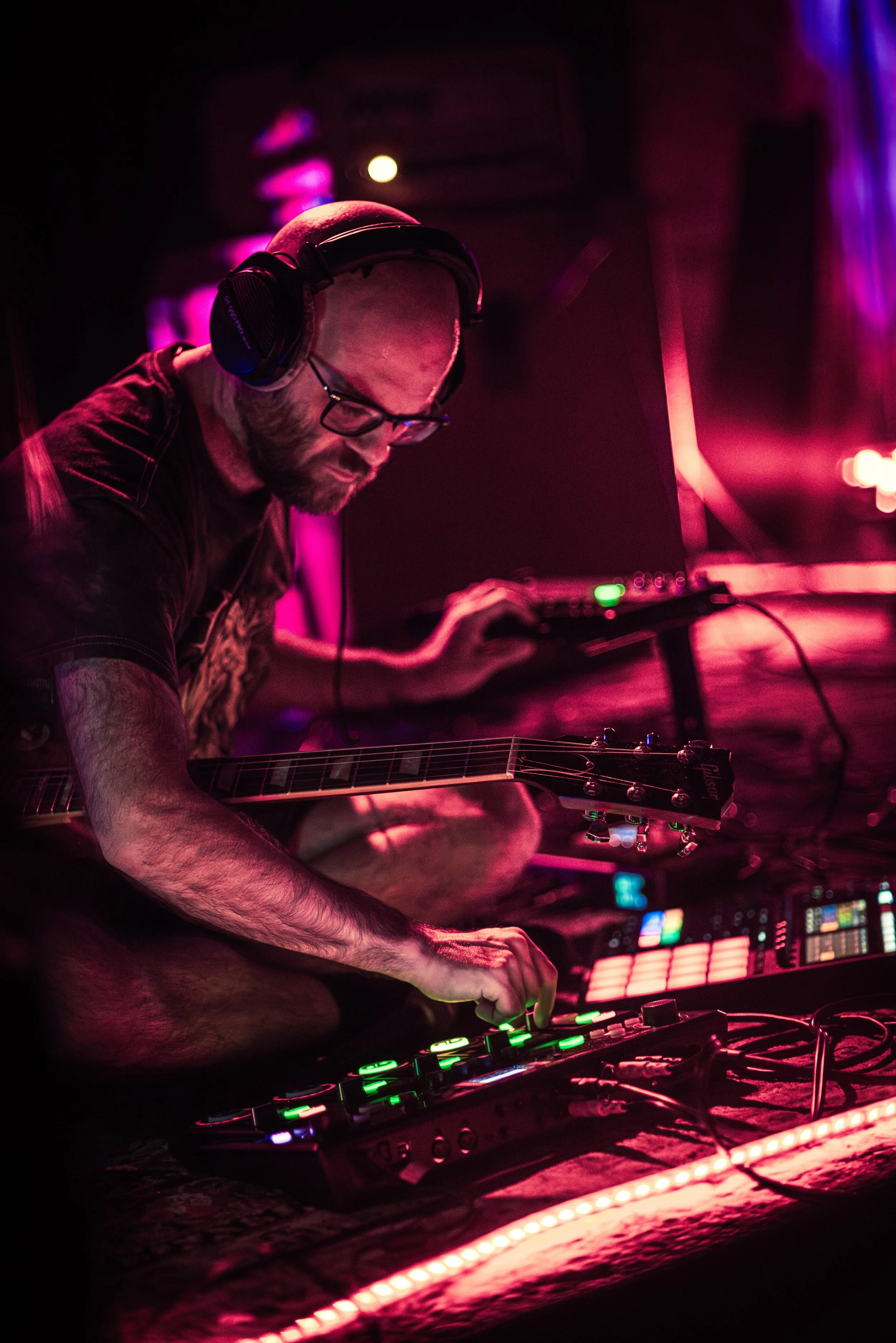 Billy Mays III sits cross-legged in his home studio, a Gibson balanced on his knee, and a wiry network of flashing gizmos spread across the carpet. The audience has caught him in his natural state — blissed out, wandering through an ethereal, amniotic groove. He streams out these improvised performances every week on his Twitch channel, but unlike the screaming gamers who dominate the platform, Mays III remains almost entirely wordless on camera. He strums a palm-muted chord halfway down the neck, introducing a sleepy, motorik rhythm to the undertow, before slipping toward an icy, David Gilmour riff. The loops coalesce — like loose threads magically spindling into a crescendo — and a smile jumps across Mays III’s face. He weaves the bass back in to punctuate the downbeat; there’s no euphoria quite like crushing your mix.”